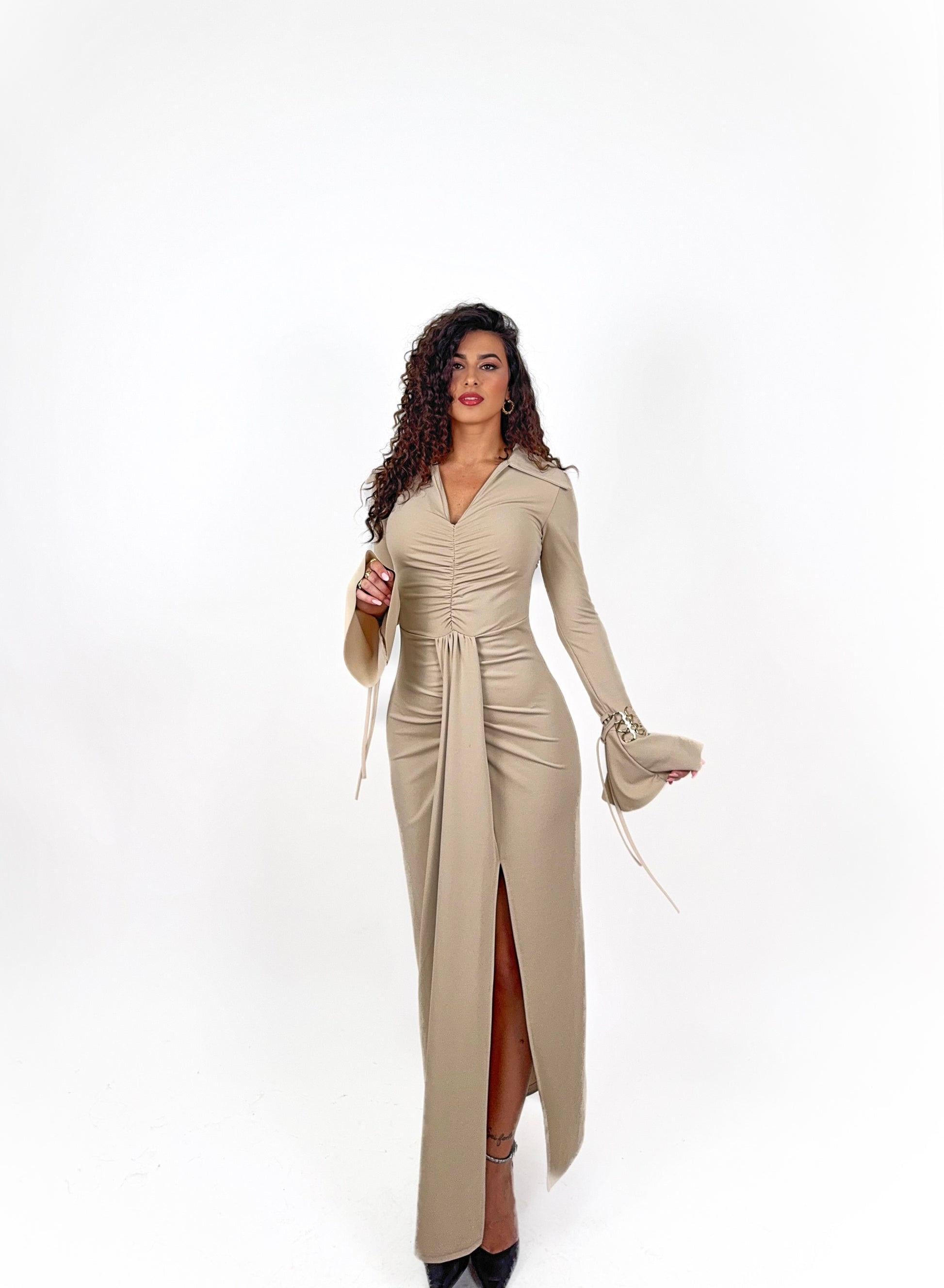 L’abito è un elegante vestito lungo in tonalità beige-sabbia, dal taglio aderente e raffinato. Presenta uno scollo a V con colletto, arricciature centrali che valorizzano il busto e la linea della vita, e una gonna lunga con spacco frontale che dona movimento e sensualità. Le maniche lunghe svasate sono impreziosite da bracciali incorporati decorativi sul polsino, un dettaglio originale che aggiunge un tocco di lusso e unicità all’outfit. Scarpa a punta nera per un contrasto elegante e minimale.