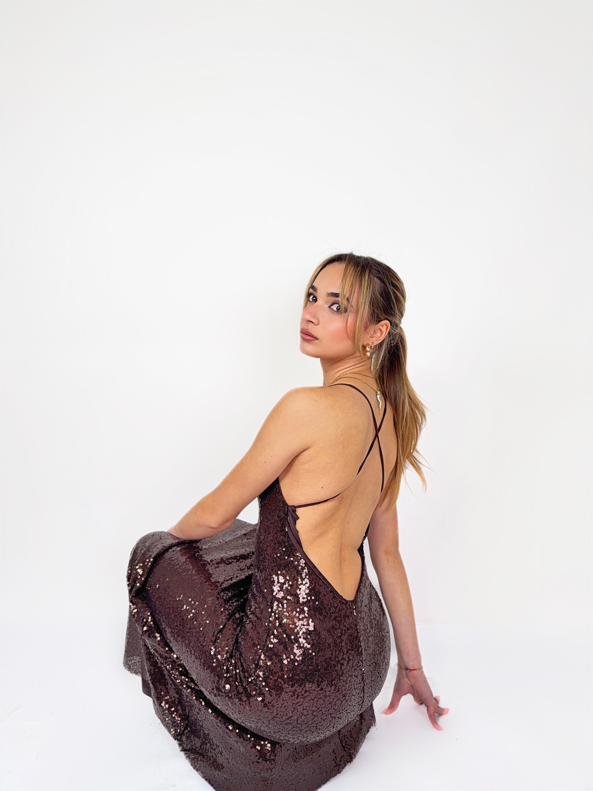 Il tessuto in paillettes illumina ogni movimento, creando un effetto sofisticato e magnetico. Lo scollo delicato sul davanti bilancia perfettamente la schiena completamente scoperta, protagonista assoluta del design: femminile, sensuale, ma sempre raffinata.