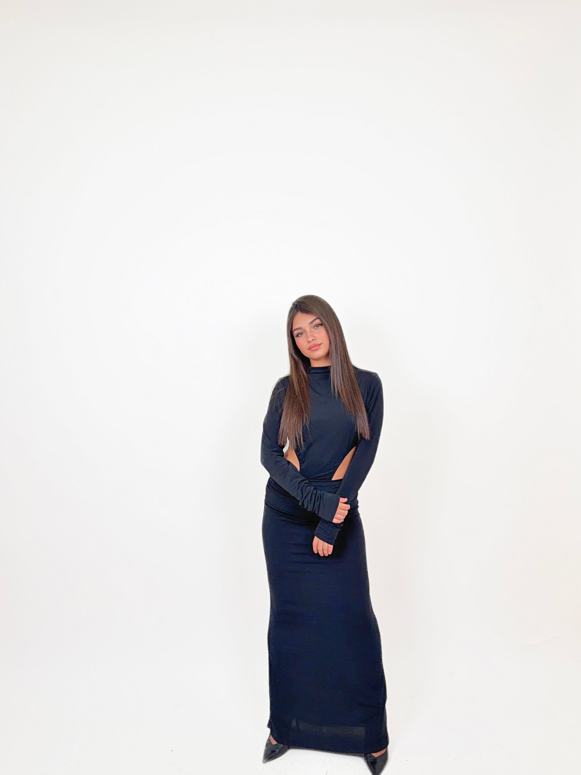 Questo abito lungo è la perfetta combinazione tra sensualità moderna ed eleganza minimal. Realizzato in un tessuto elasticizzato che abbraccia il corpo come una seconda pelle, scolpisce la silhouette e slancia la figura con un effetto naturalmente modellante.