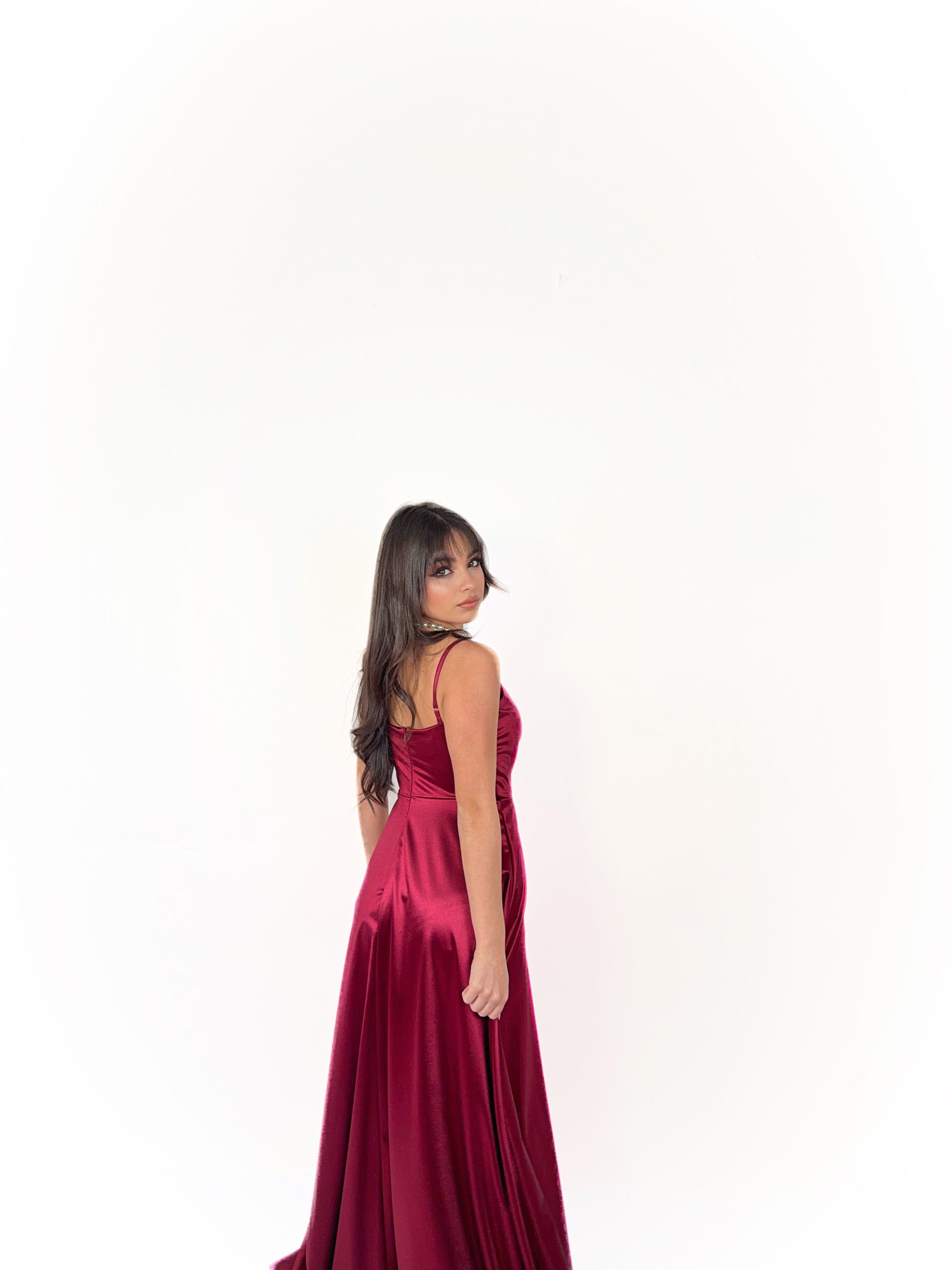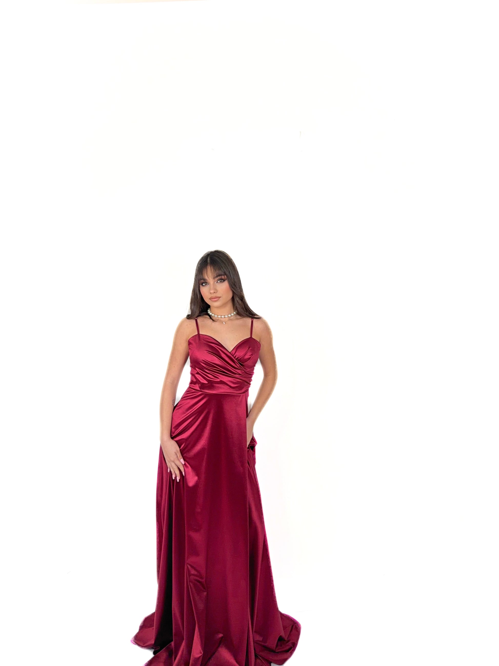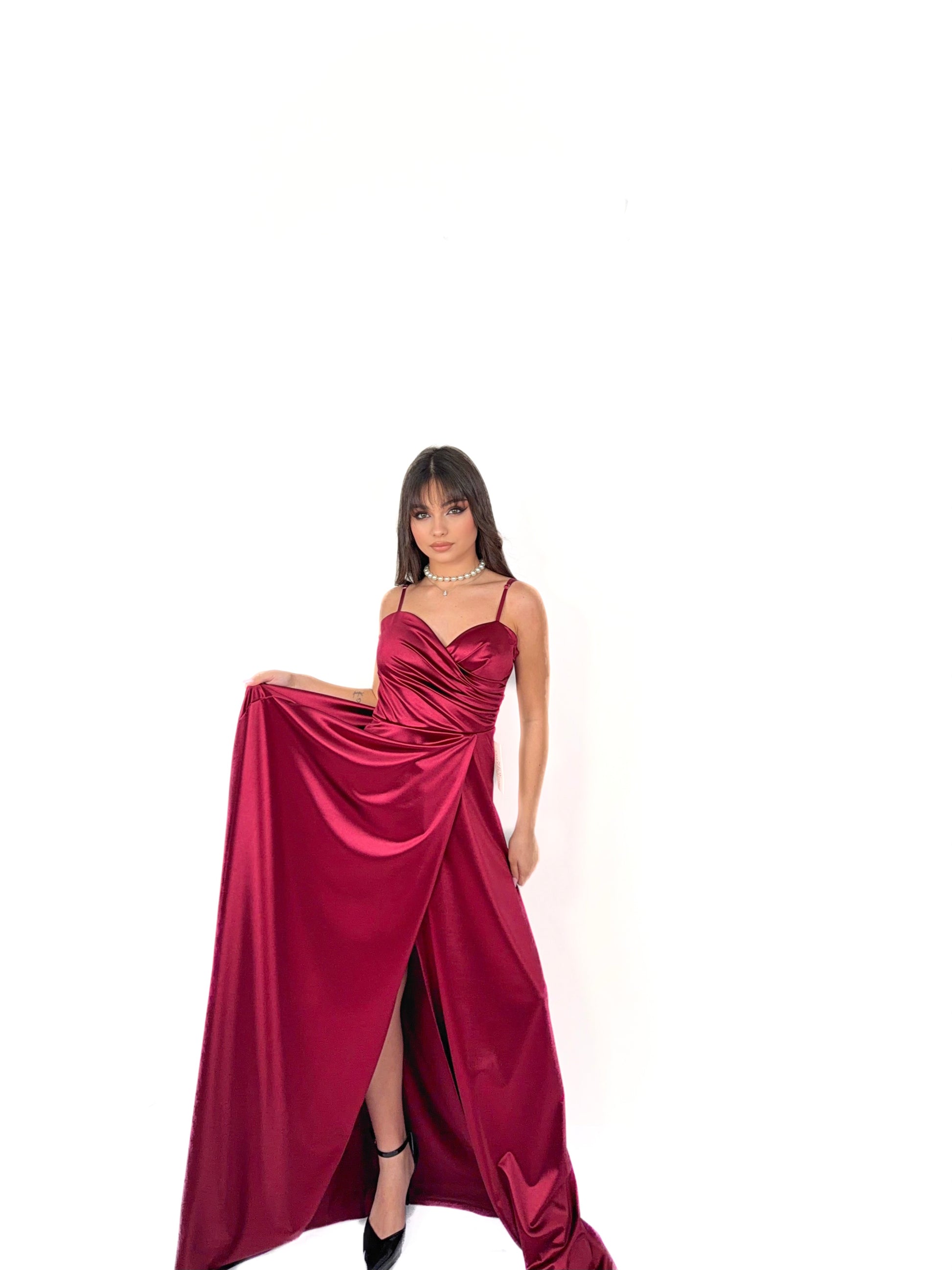 Abito lungo dal fascino sofisticato e sensuale, realizzato in tessuto satinato luminoso che accarezza la silhouette con eleganza. Il corpetto presenta uno scollo a cuore con delicato drappeggio incrociato, studiato per valorizzare il décolleté e adattarsi armoniosamente alle forme.