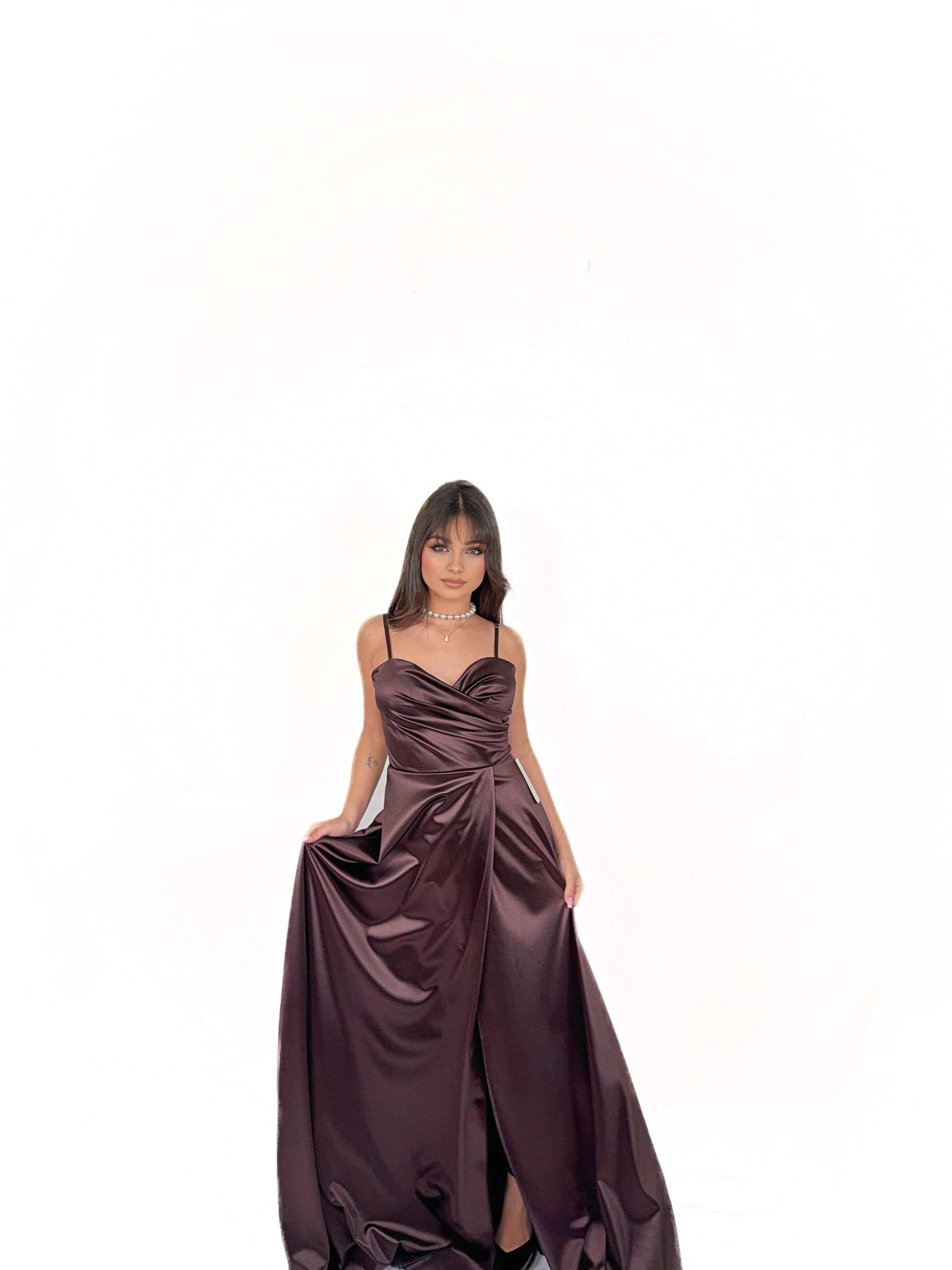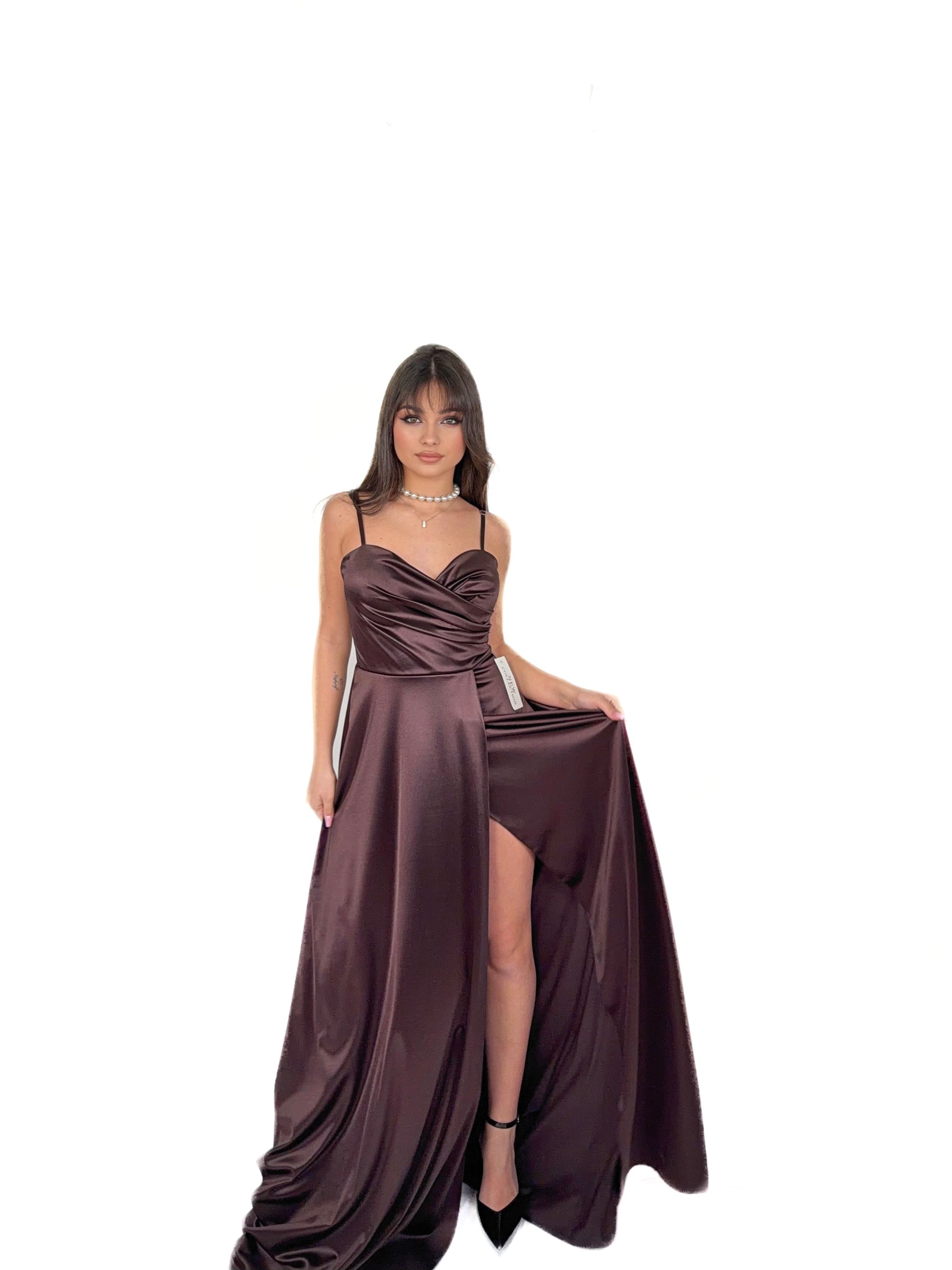 Abito lungo dal fascino sofisticato e sensuale, realizzato in tessuto satinato luminoso che accarezza la silhouette con eleganza. Il corpetto presenta uno scollo a cuore con delicato drappeggio incrociato, studiato per valorizzare il décolleté e adattarsi armoniosamente alle forme.
