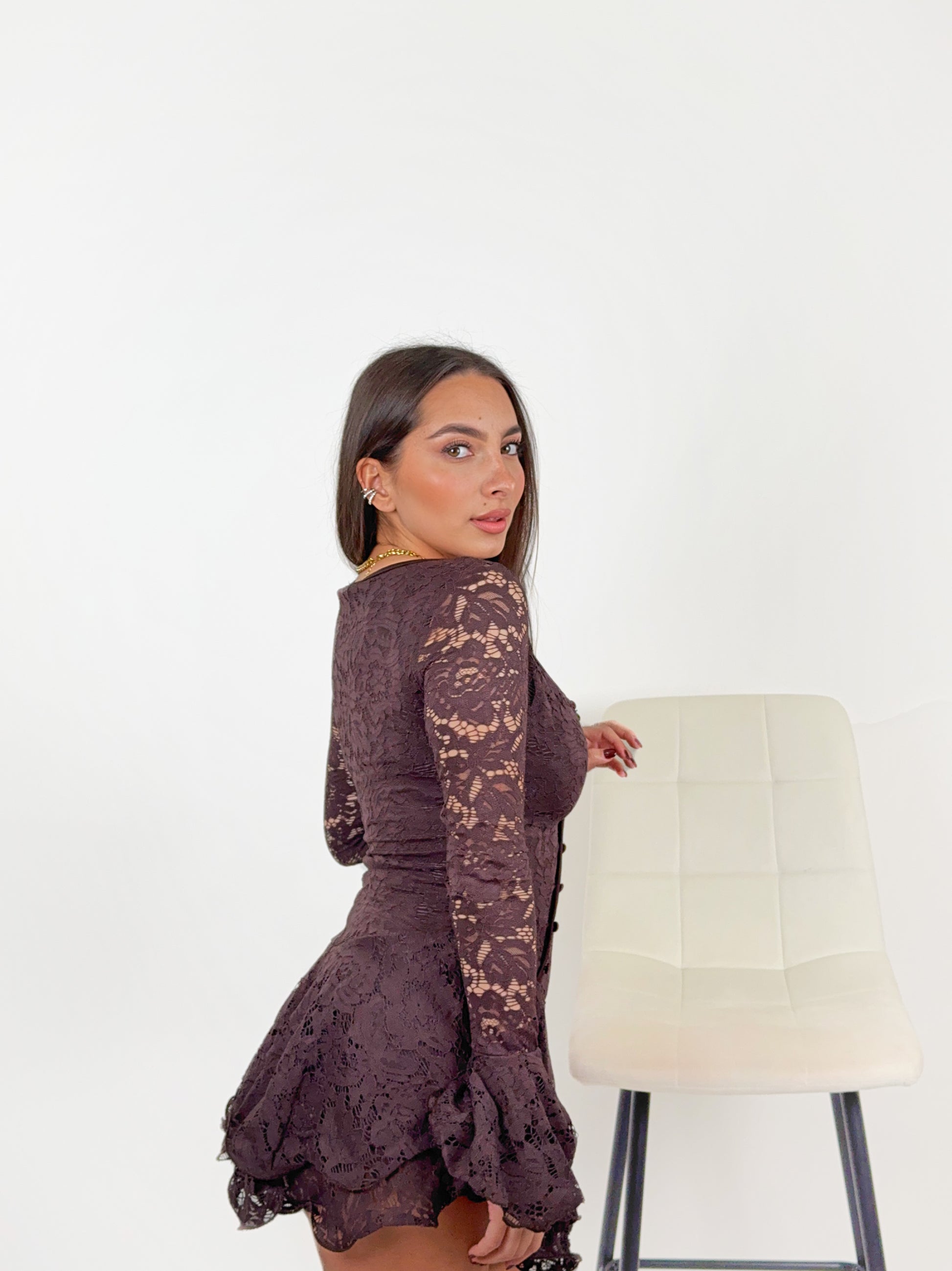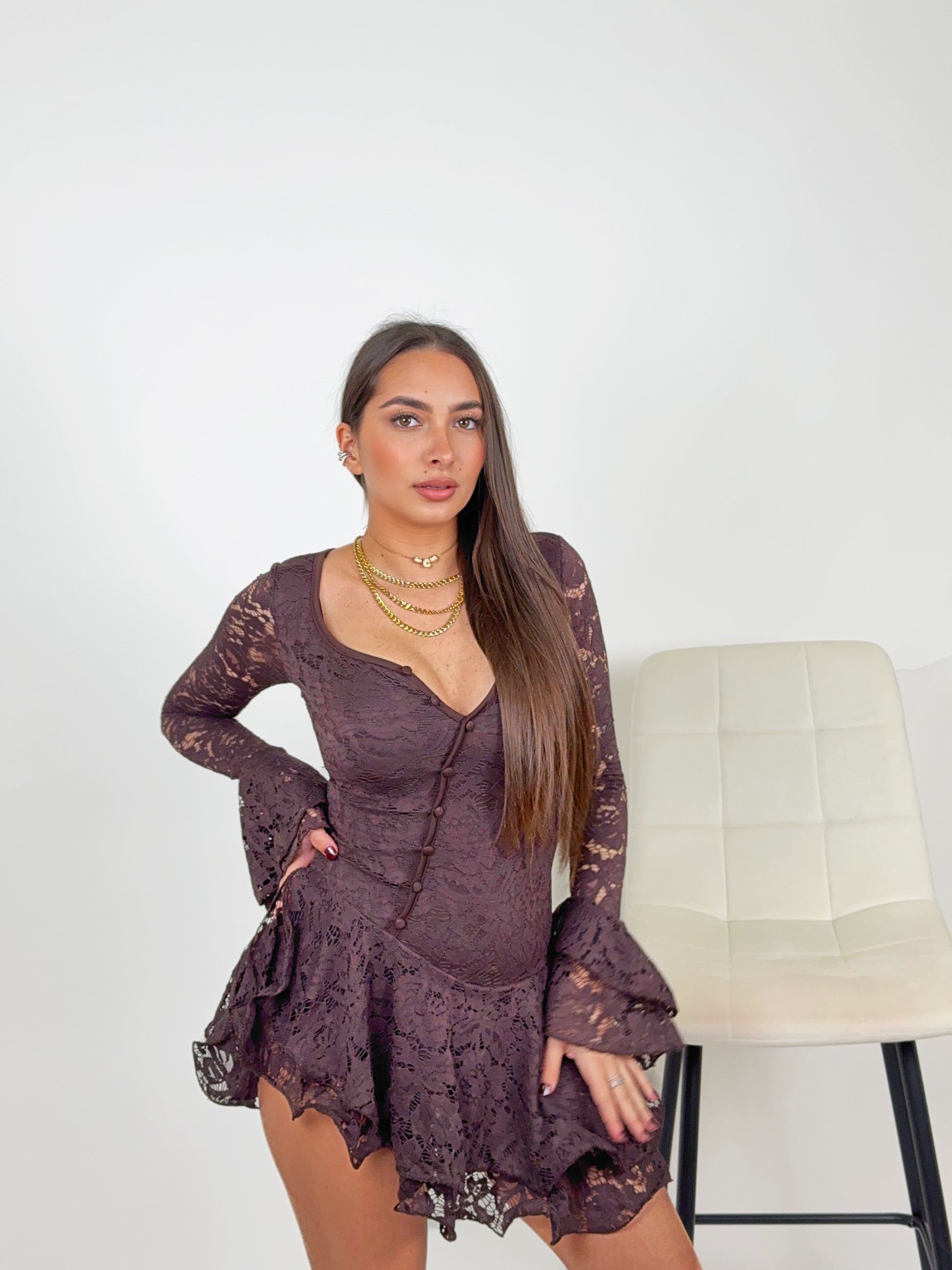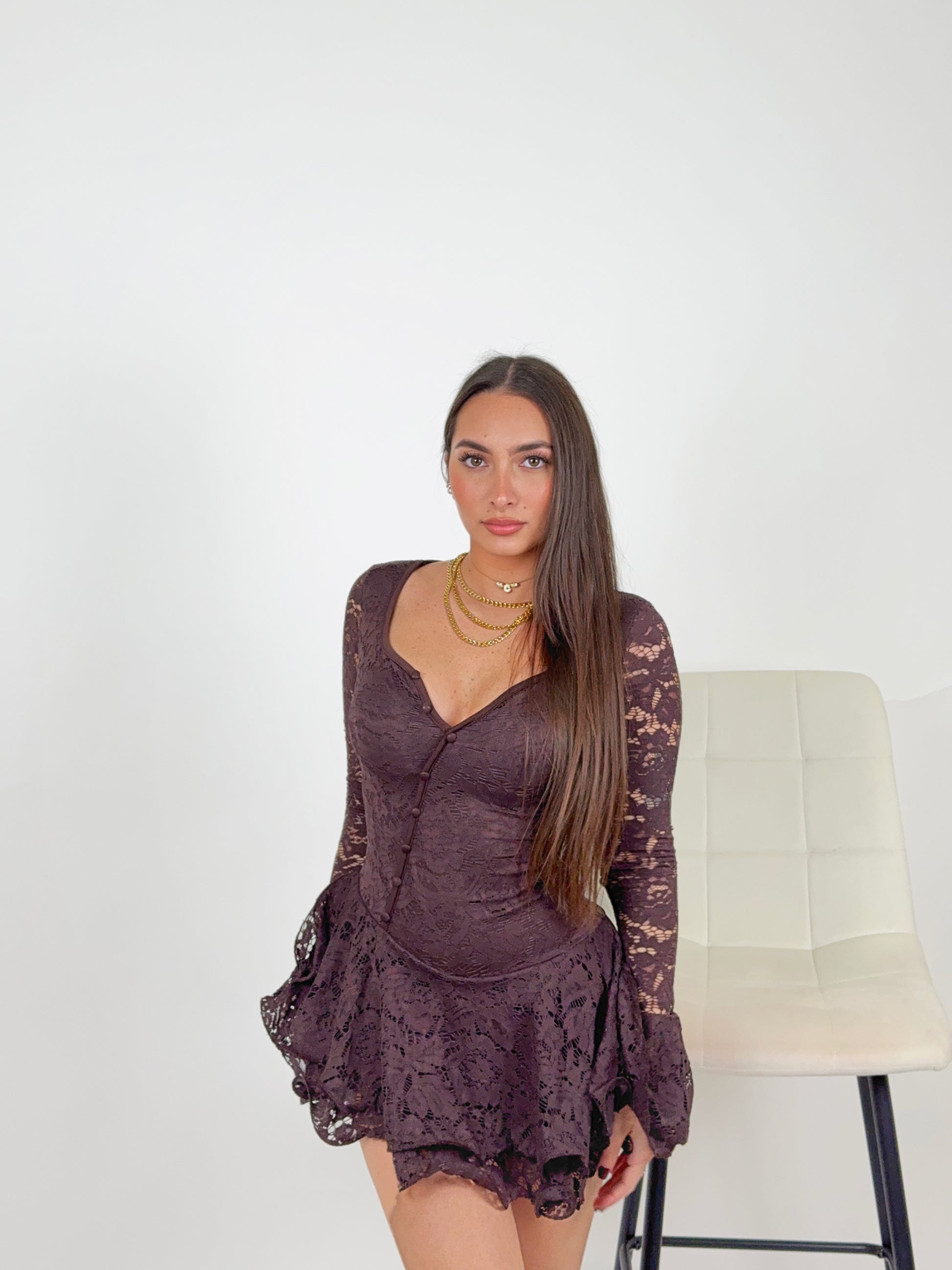 La parte superiore esalta elegantemente il décolleté grazie allo scollo a cuore e alla fila di bottoncini tono su tono, che donano un tocco raffinato e slanciato alla figura. Le maniche lunghe in pizzo semi-trasparente aggiungono sensualità, mentre i polsini svasati creano un effetto romantico e ricercato, perfetto per ogni occasione speciale.