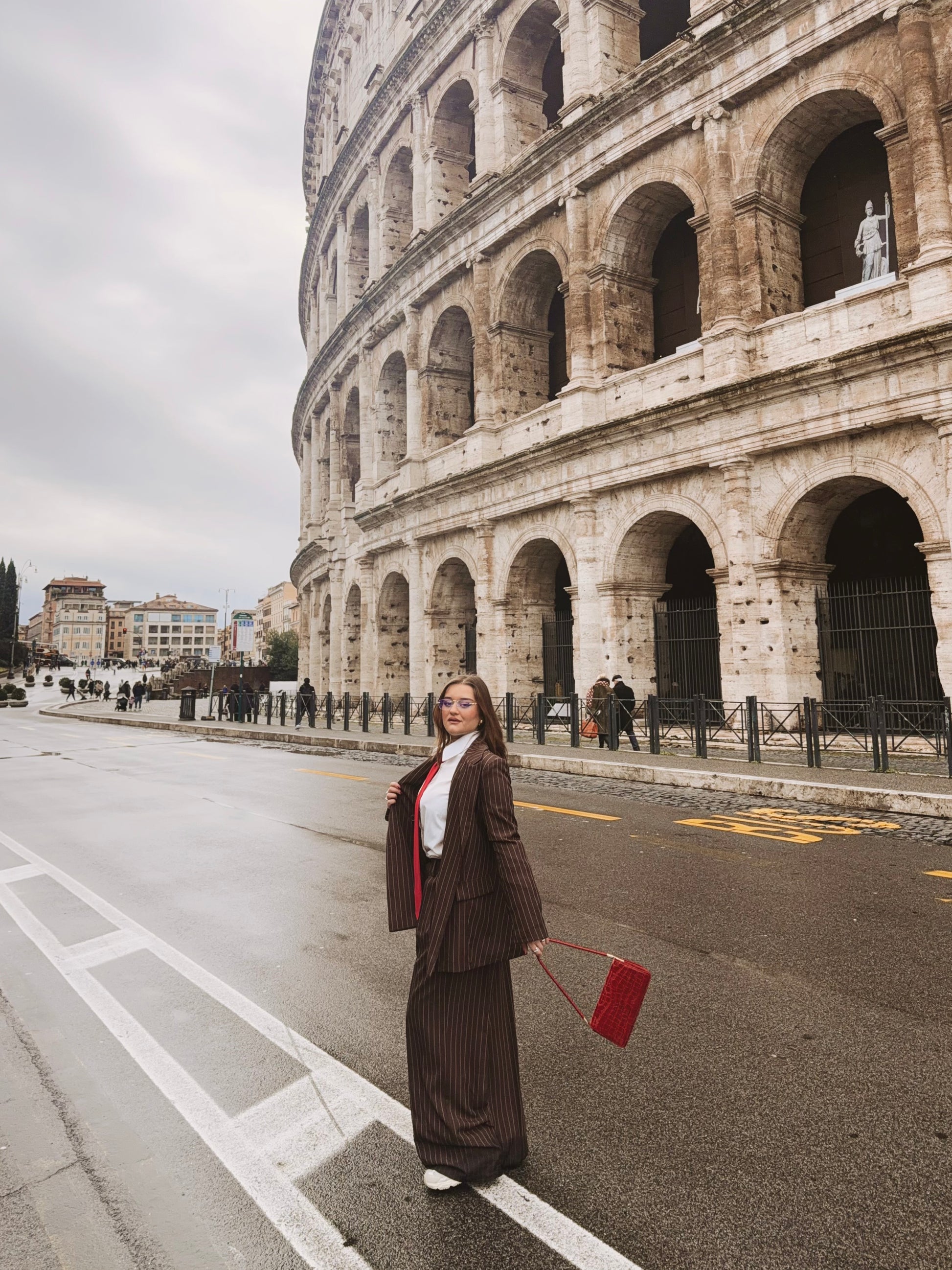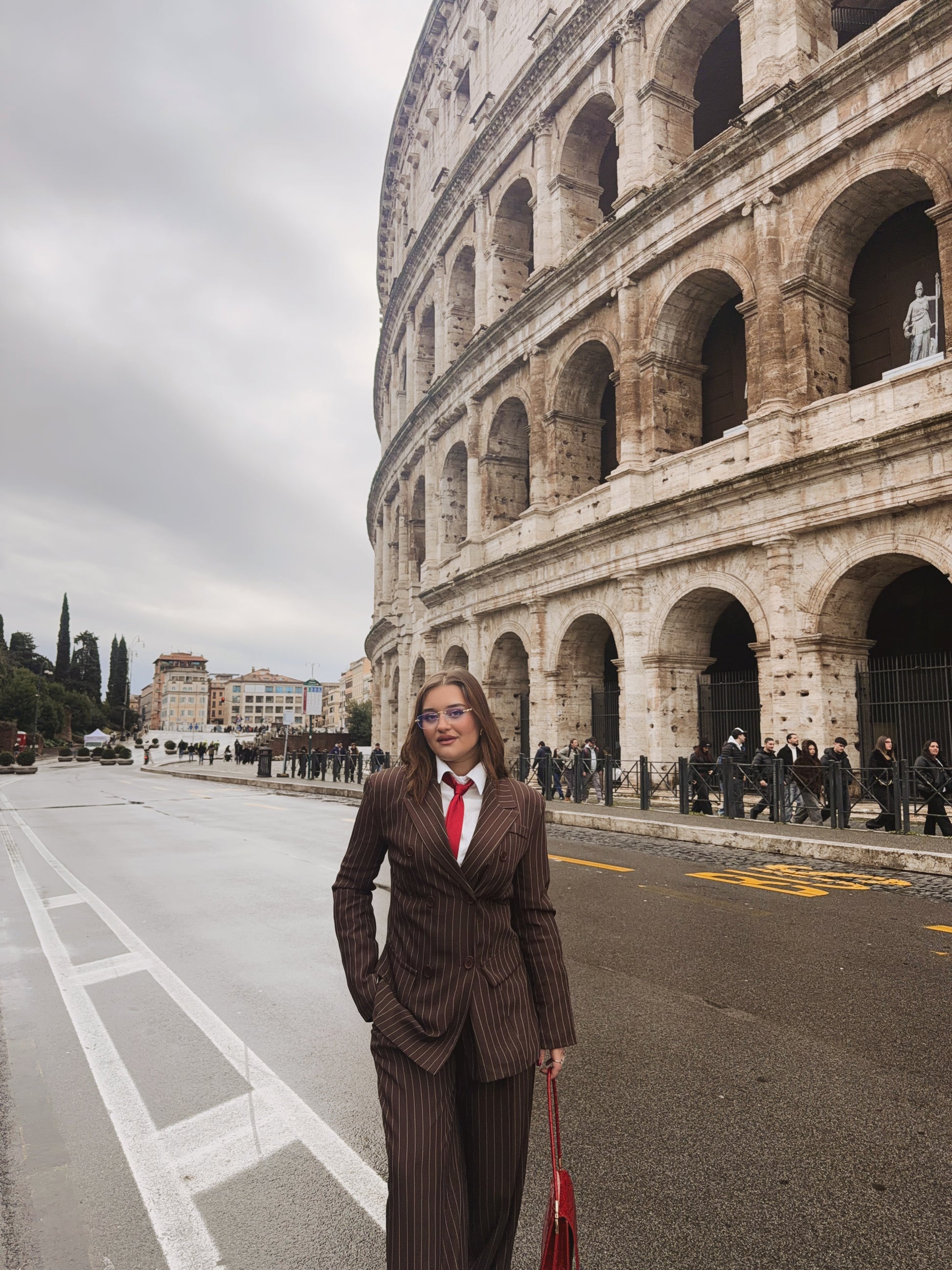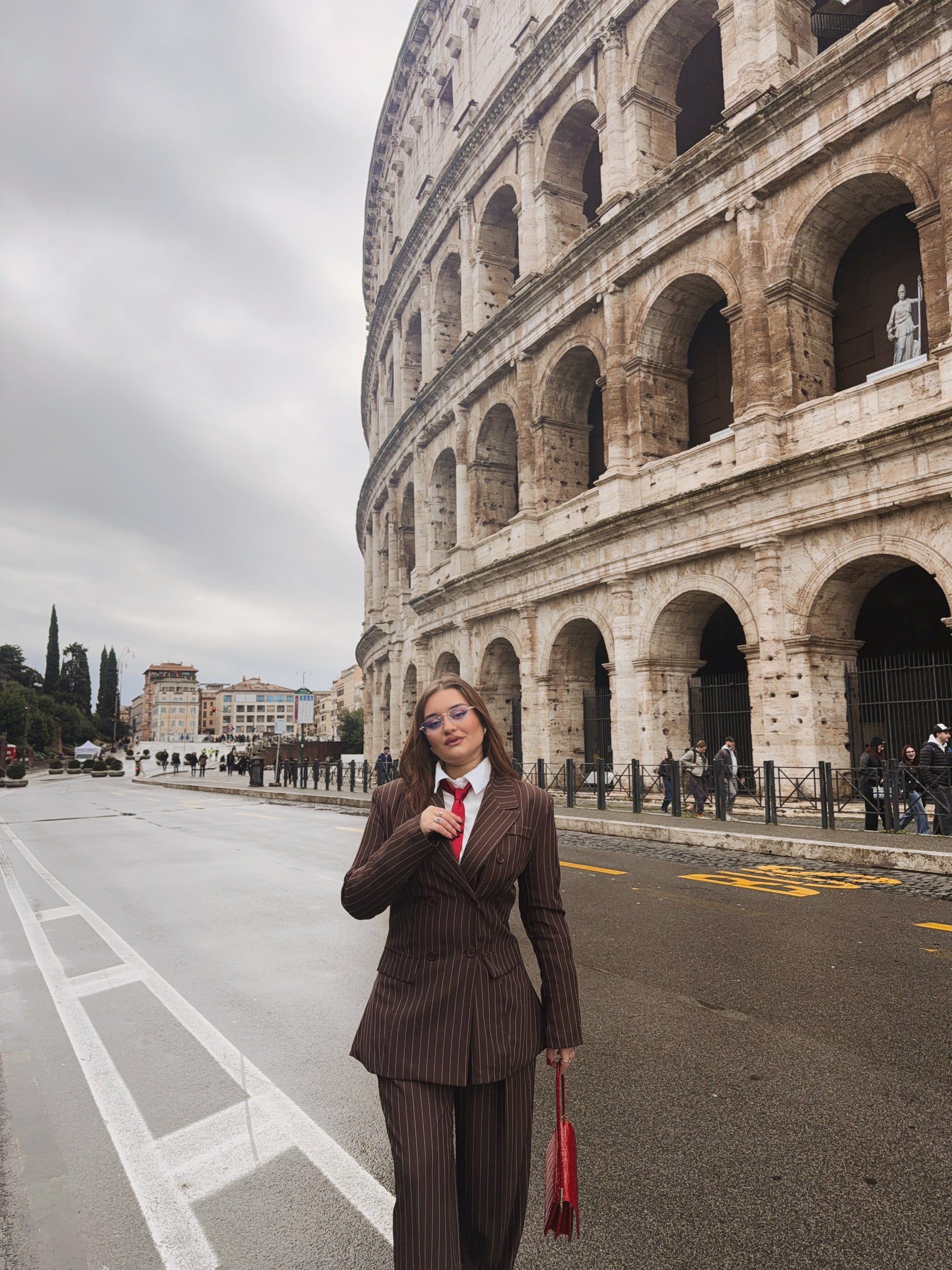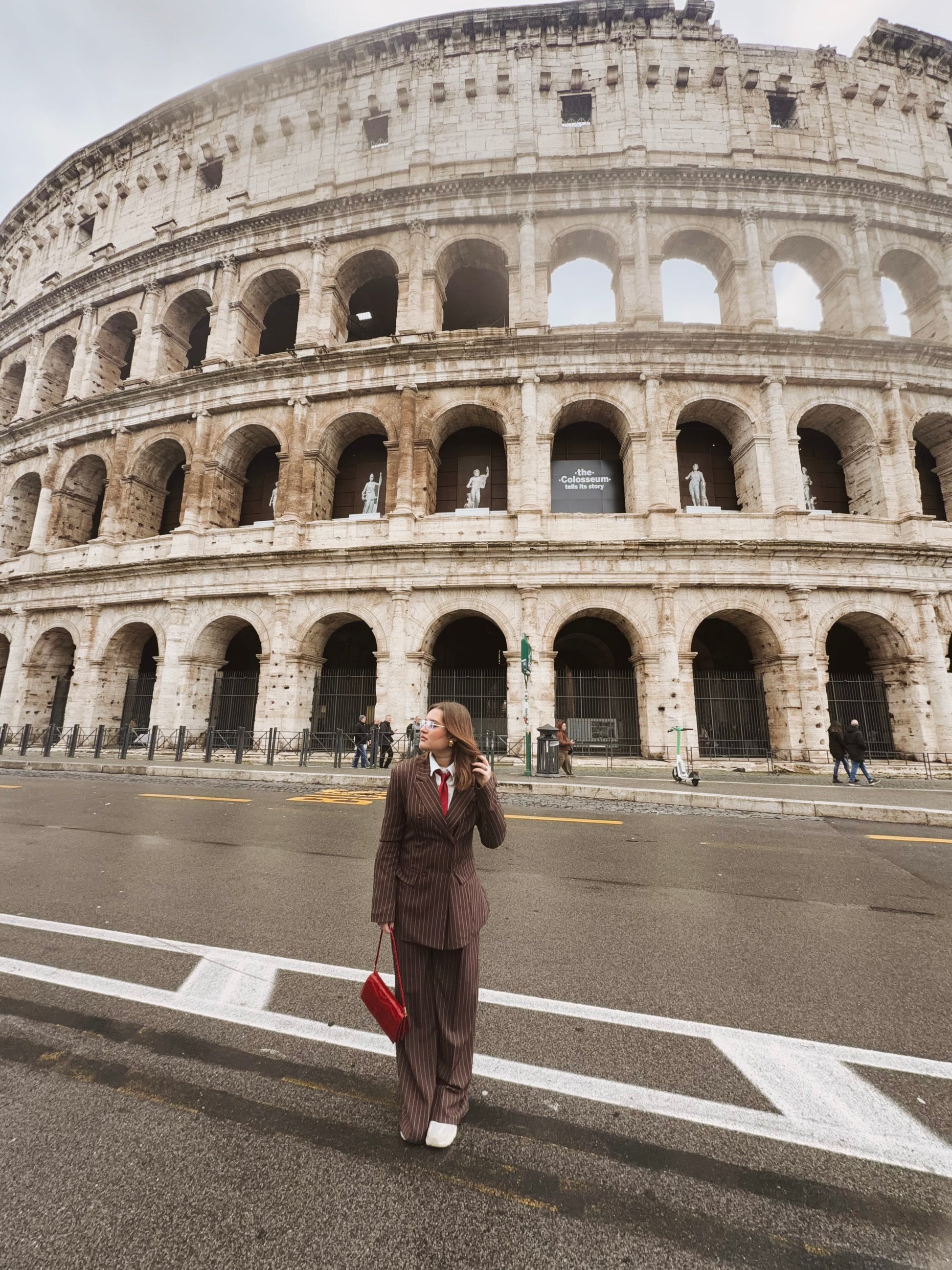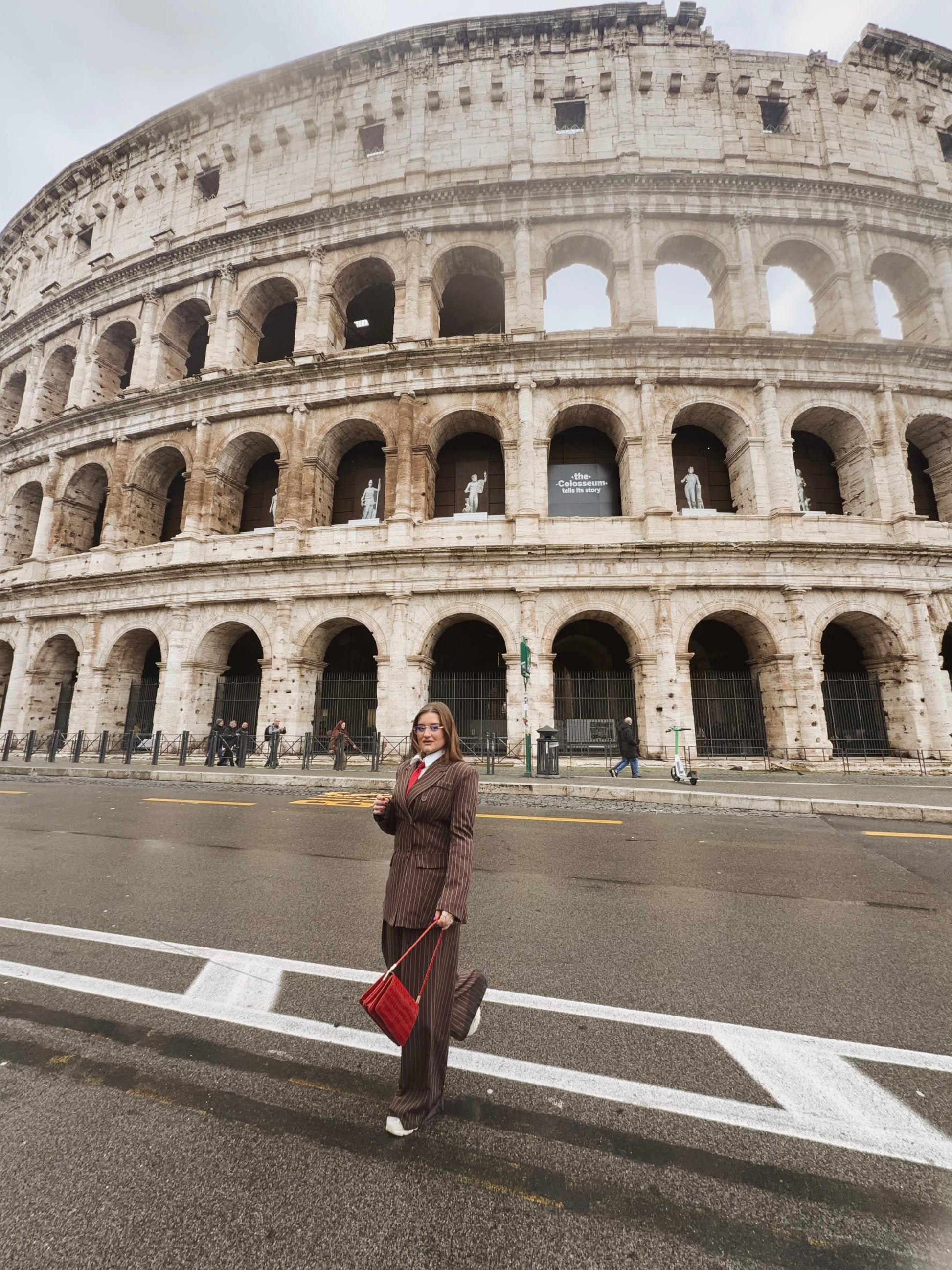 Il tailleur gessato marrone richiama i toni caldi della pietra antica del Colosseo, creando un dialogo visivo potente con uno dei simboli più iconici di Roma.