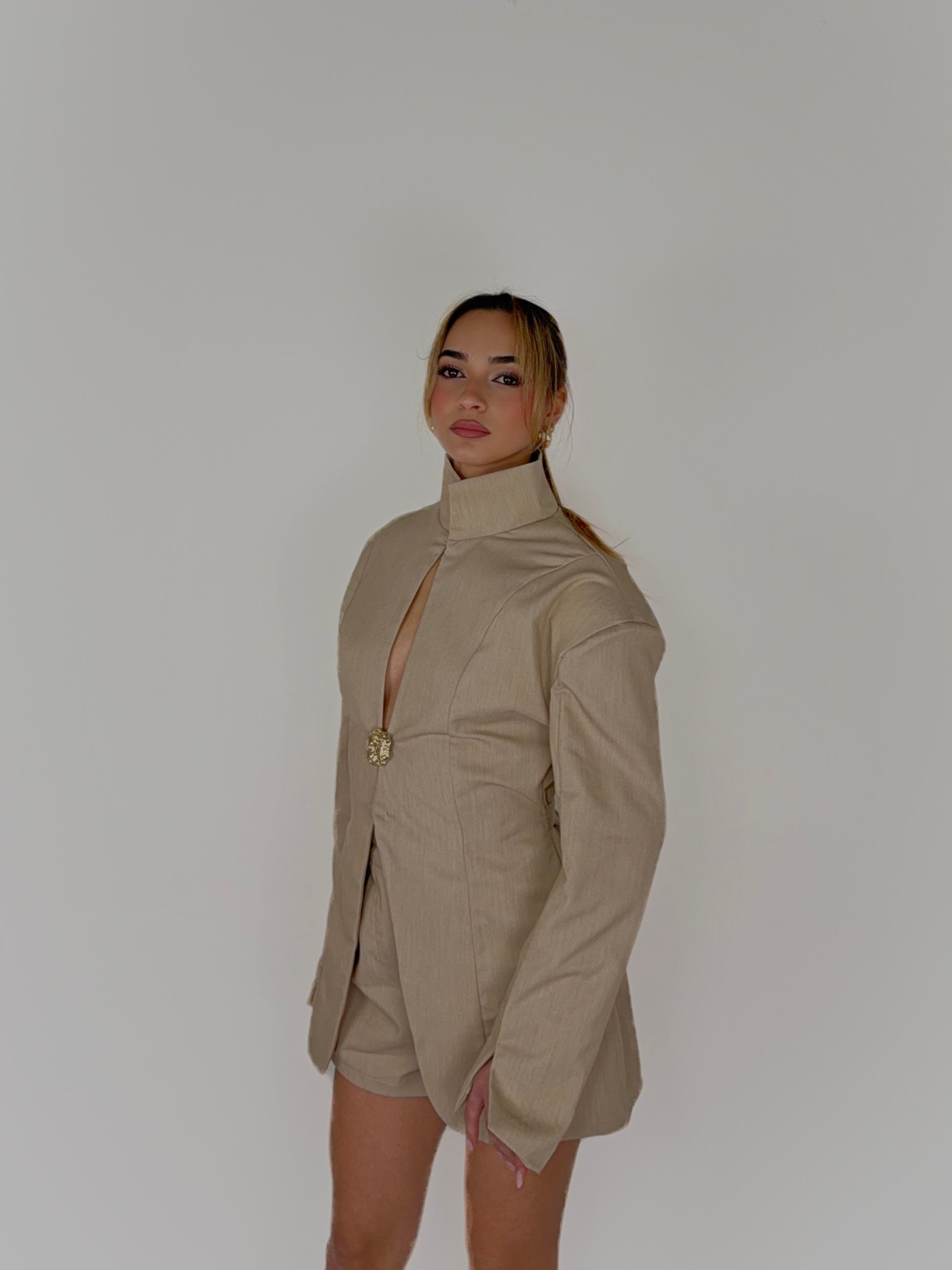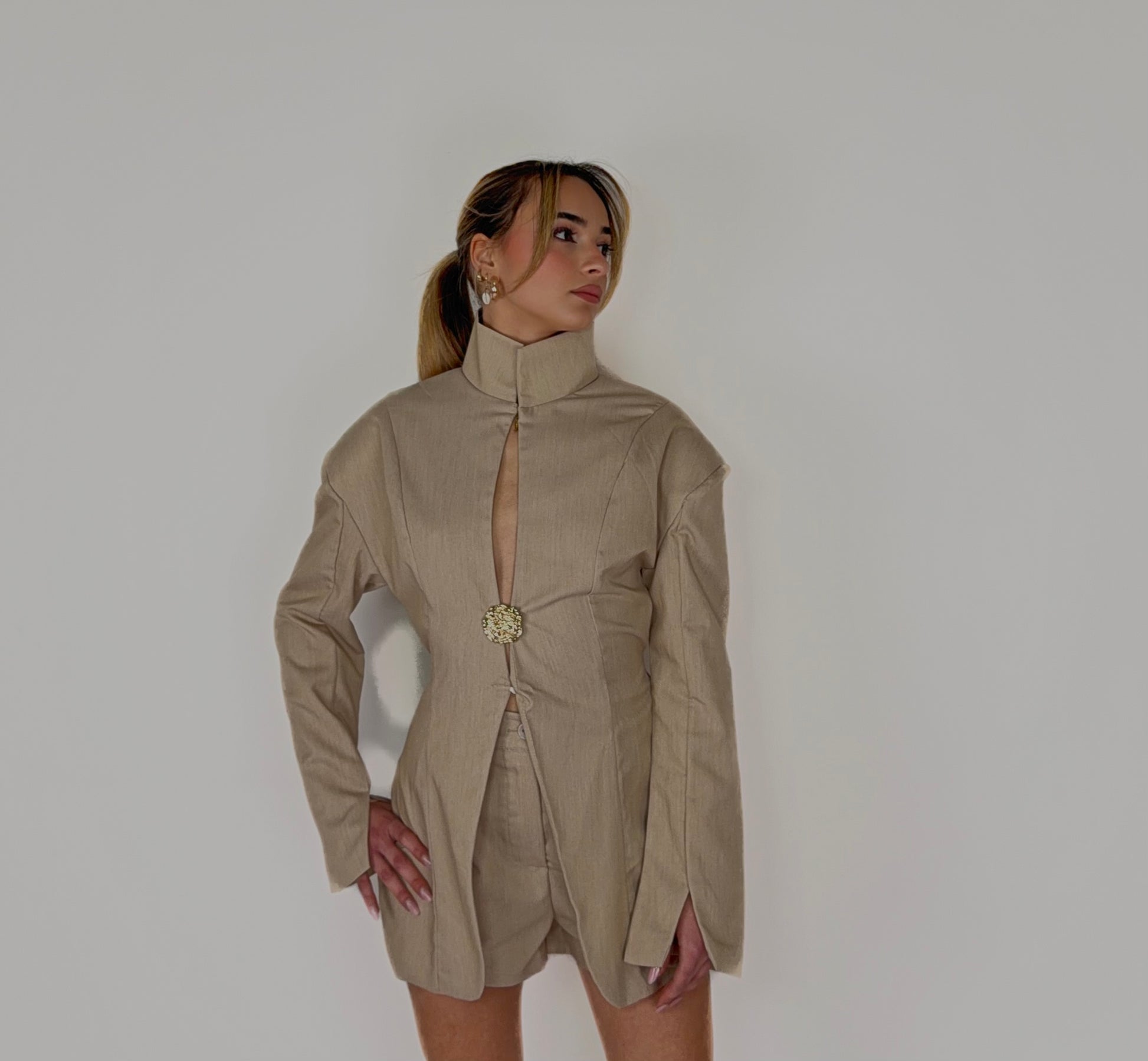 Il blazer presenta una costruzione ricercata con spalline interne che definiscono la figura e valorizzano la postura. Il collo alto dona un’allure sofisticata e decisa, mentre lo scollo centrale crea un gioco di sensualità elegante, mai eccessiva. Il dettaglio gioiello frontale illumina il capo e lo rende unico, trasformandolo in un vero pezzo iconico.