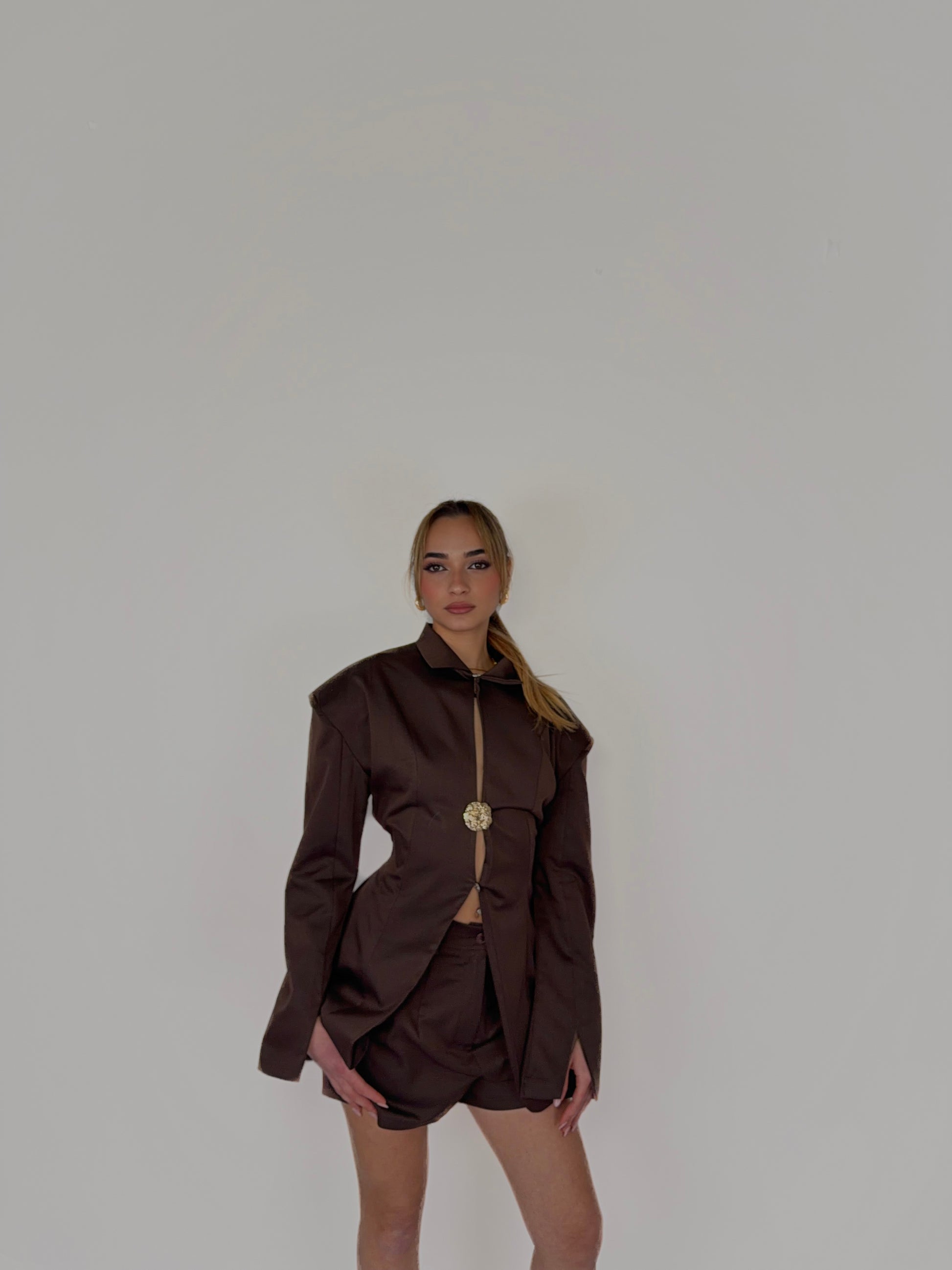 Il blazer presenta una costruzione ricercata con spalline interne che definiscono la figura e valorizzano la postura. Il collo alto dona un’allure sofisticata e decisa, mentre lo scollo centrale crea un gioco di sensualità elegante, mai eccessiva. Il dettaglio gioiello frontale illumina il capo e lo rende unico, trasformandolo in un vero pezzo iconico.
