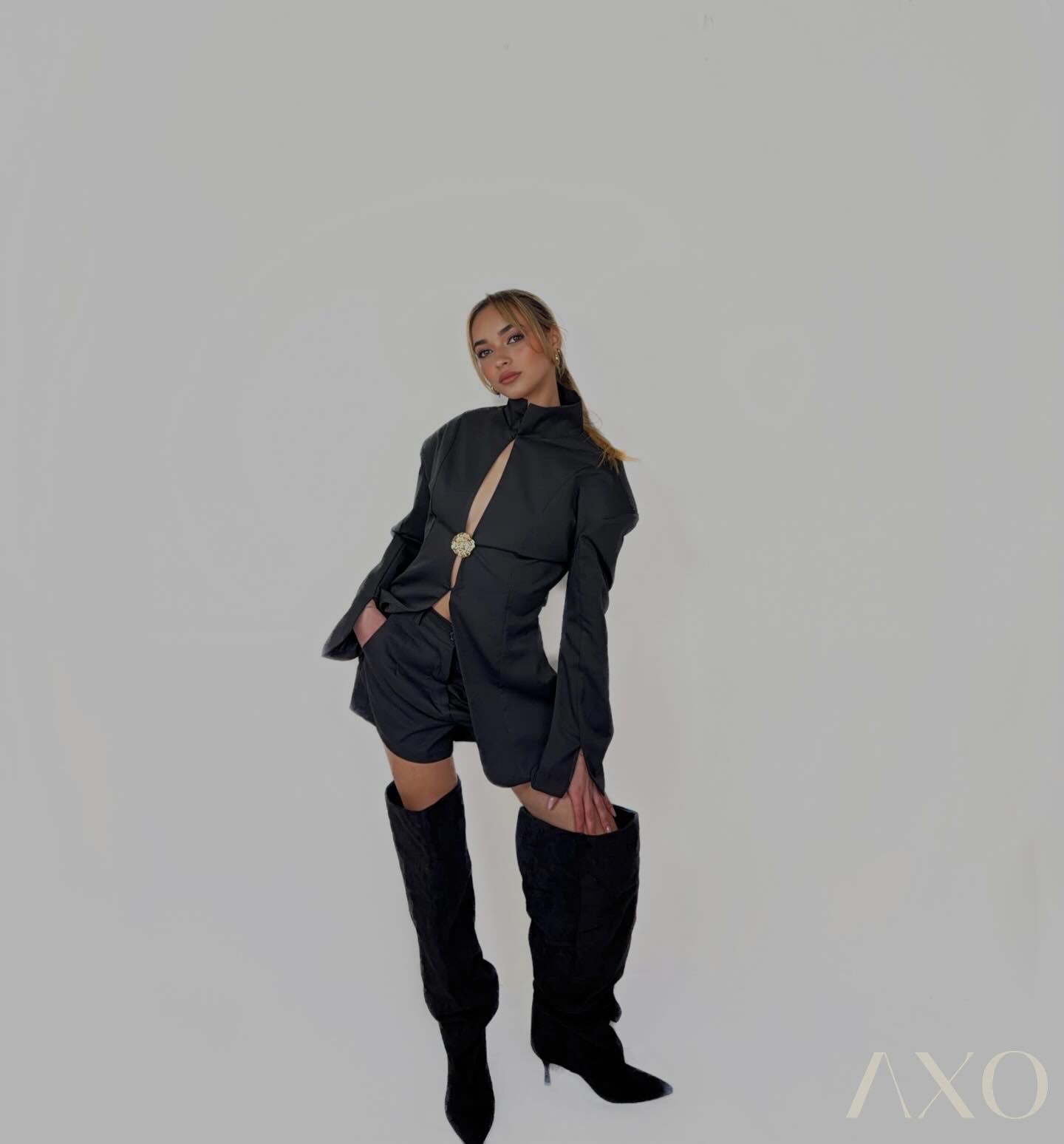 Il blazer presenta una costruzione ricercata con spalline interne che definiscono la figura e valorizzano la postura. Il collo alto dona un’allure sofisticata e decisa, mentre lo scollo centrale crea un gioco di sensualità elegante, mai eccessiva. Il dettaglio gioiello frontale illumina il capo e lo rende unico, trasformandolo in un vero pezzo iconico.