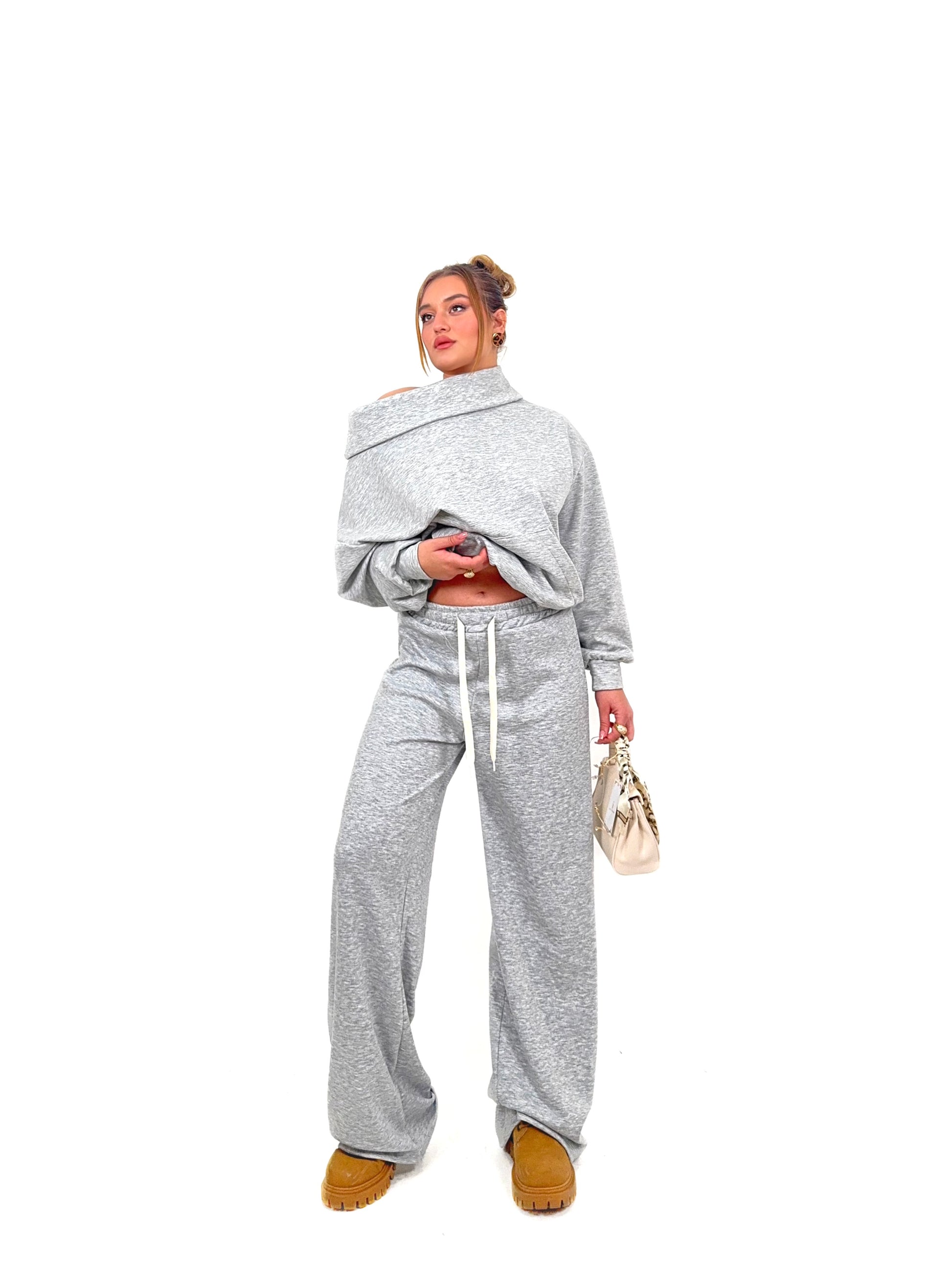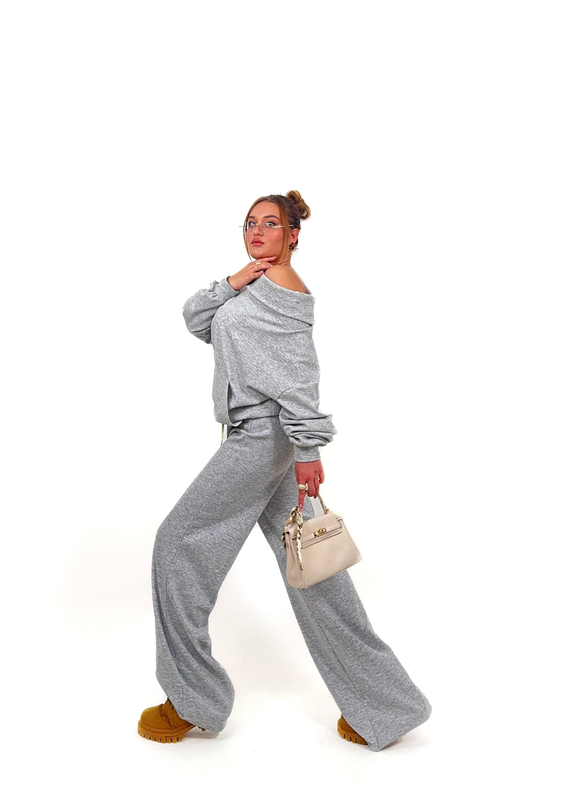 Elegante completo composto da pantalone a palazzo grigio e felpa con scollo a barca.