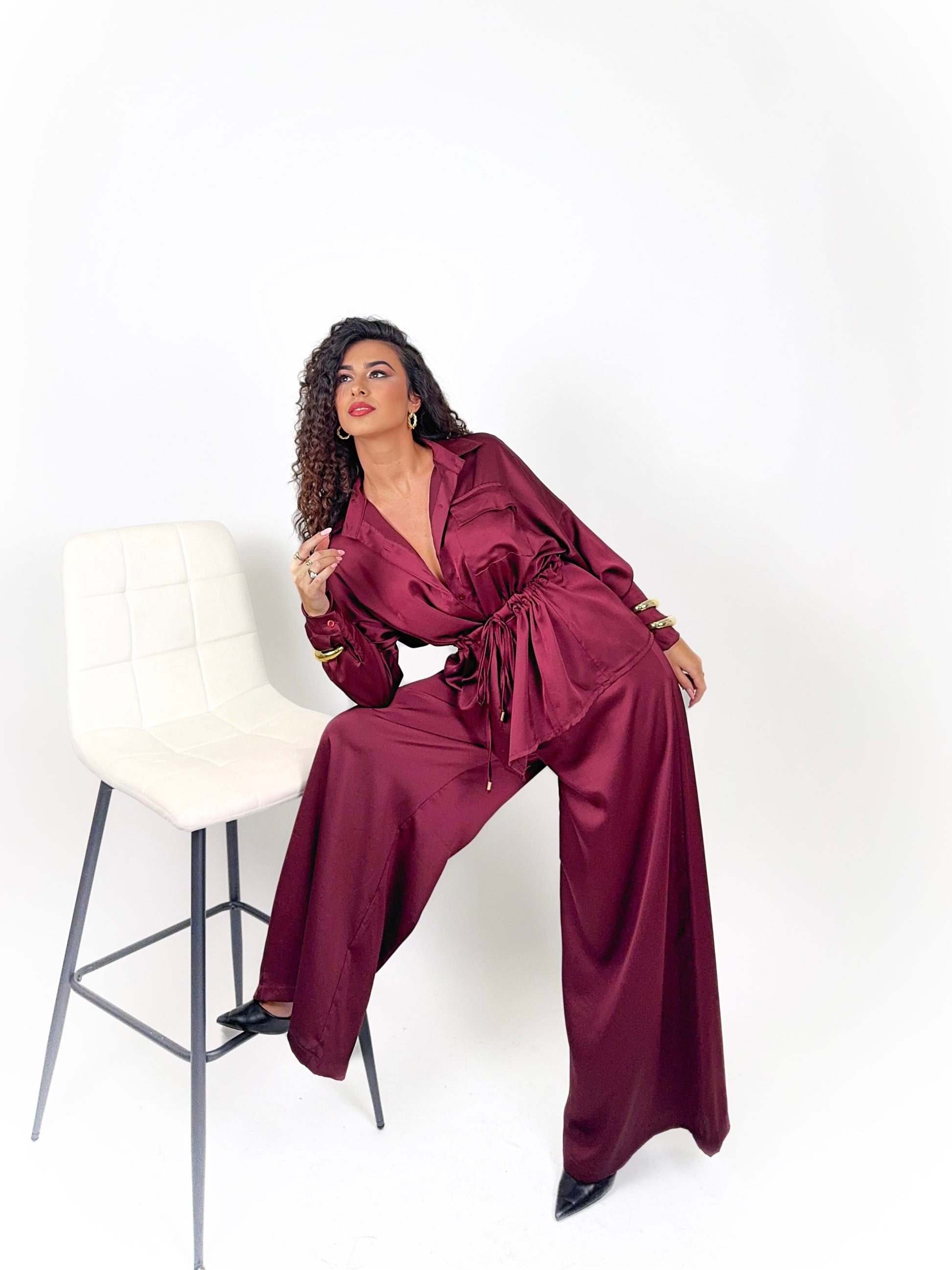 Coordinato tailleur in raso lucente, disponibile in due tonalità sofisticate: Borgogna e Marrone Cioccolato.