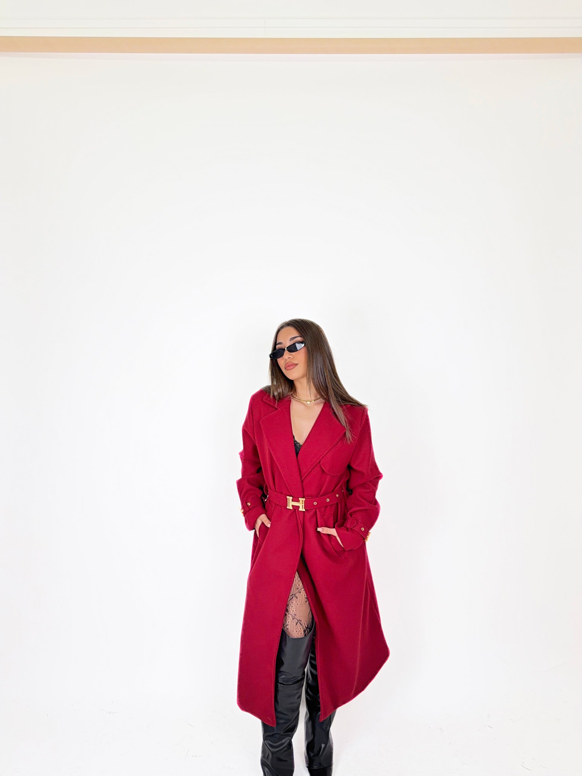 La cintura con fibbia metallica dorata, ispirata allo stile Hermès, scolpisce il punto vita e illumina l’intero cappotto con un tocco luxury immediatamente riconoscibile.