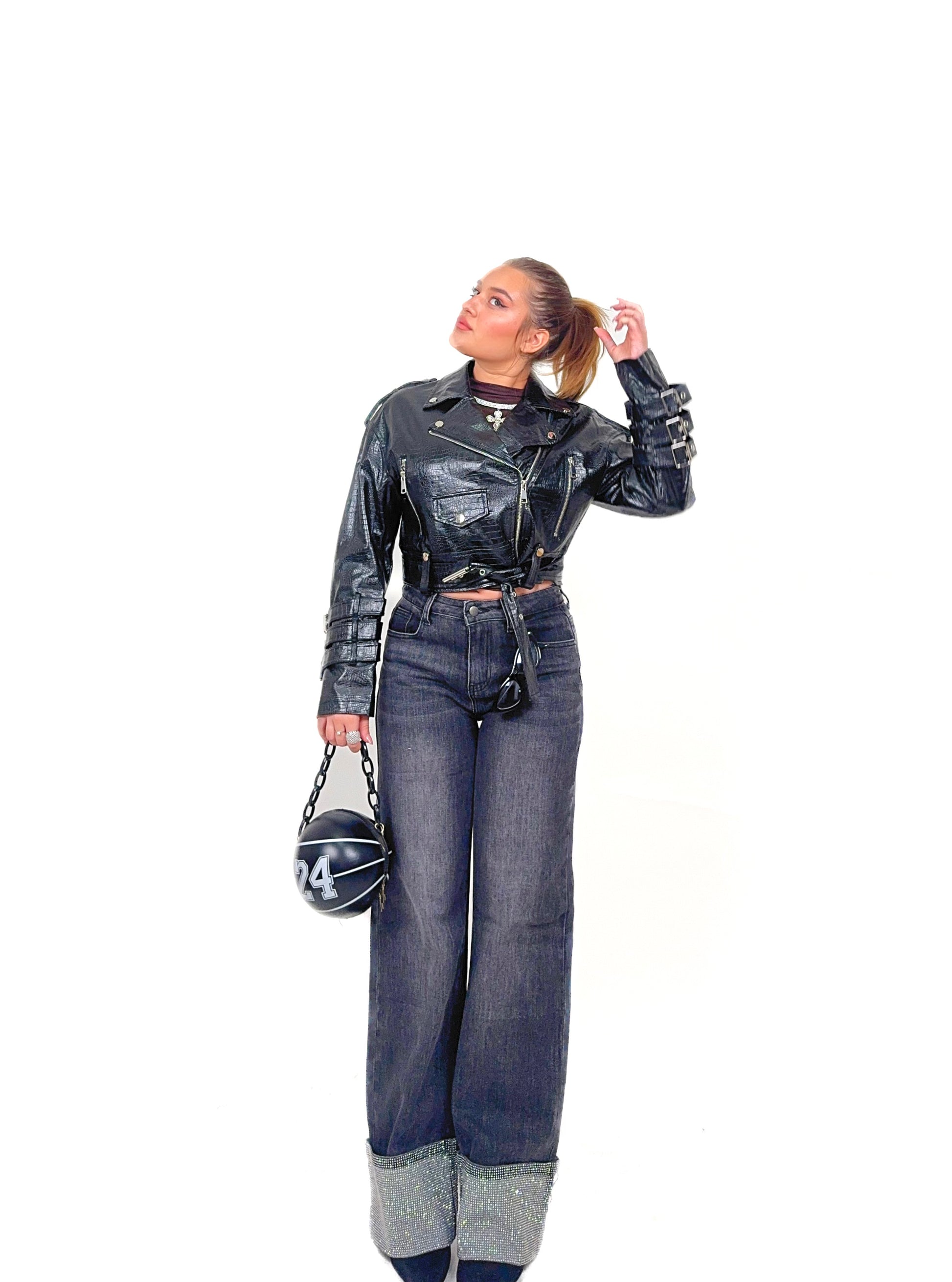 Indossala con il jeans grigio sfumato bianco, semplice ma strategico, perché fa risaltare ogni dettaglio della giacca. E sotto, gli Swarovski che illuminano ogni passo: il risultato è un look pazzesco, elegante ma con carattere.