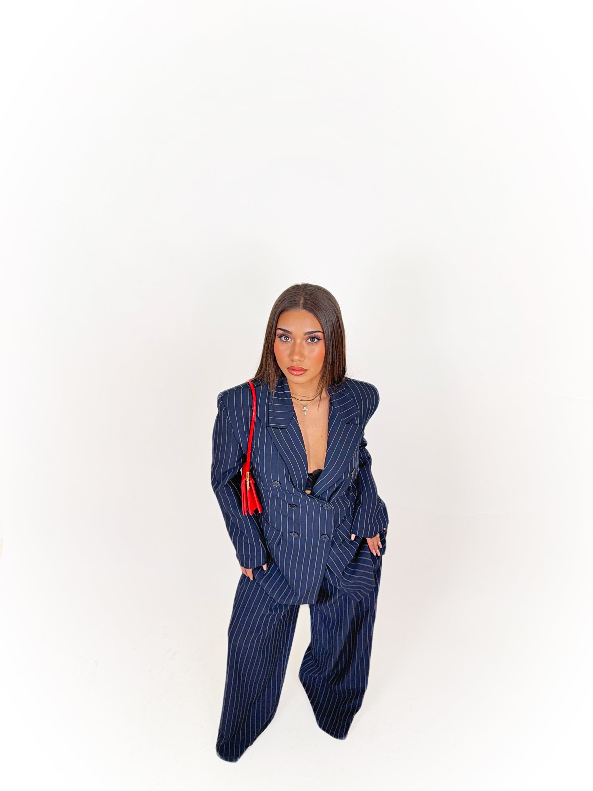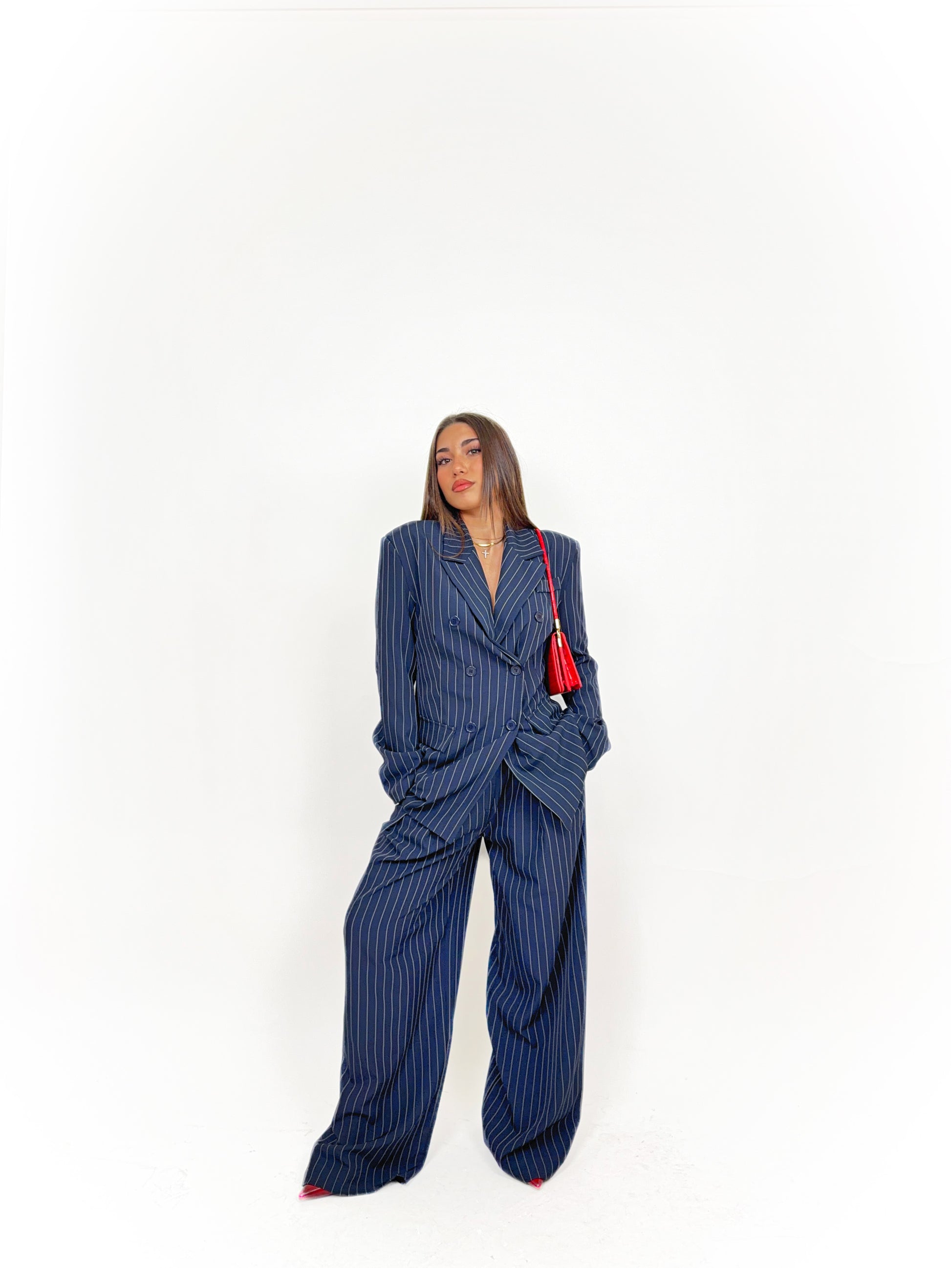 Realizzato in un raffinato tessuto blu notte a righe gessate, questo coordinato unisce carattere, stile e un’eleganza contemporanea.